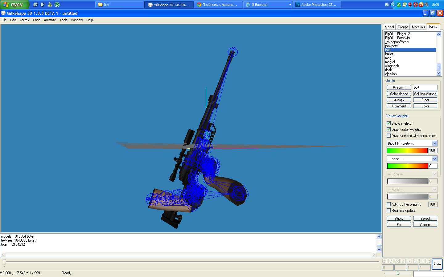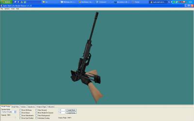 Скачал модель с короткими руками. Руки я изменил, удлинил их варварским методом, не не суть. Проблема в том, что модель вообще состоит из 10 СМД частей, не считая рук. При декомпиляции V-модели одна смд частица, отвечающаа за половину дула, куда-то пропадает. Эту частицу я нашел в W-модели, но она не хочет вставать на место. Она весит над стволом.