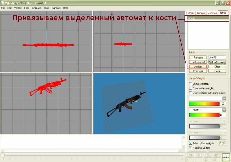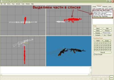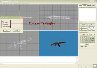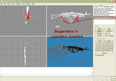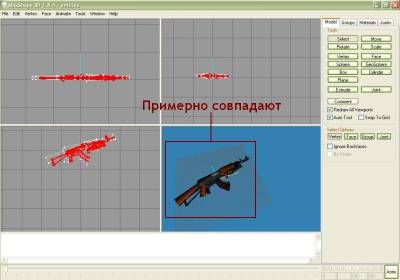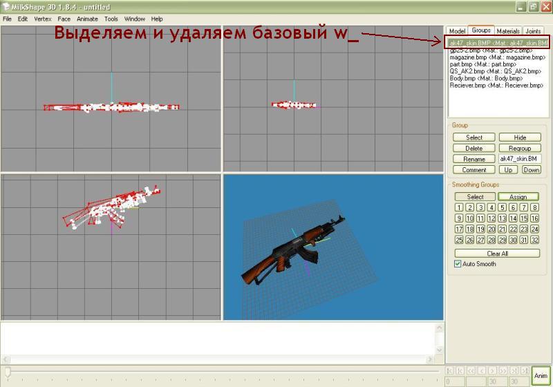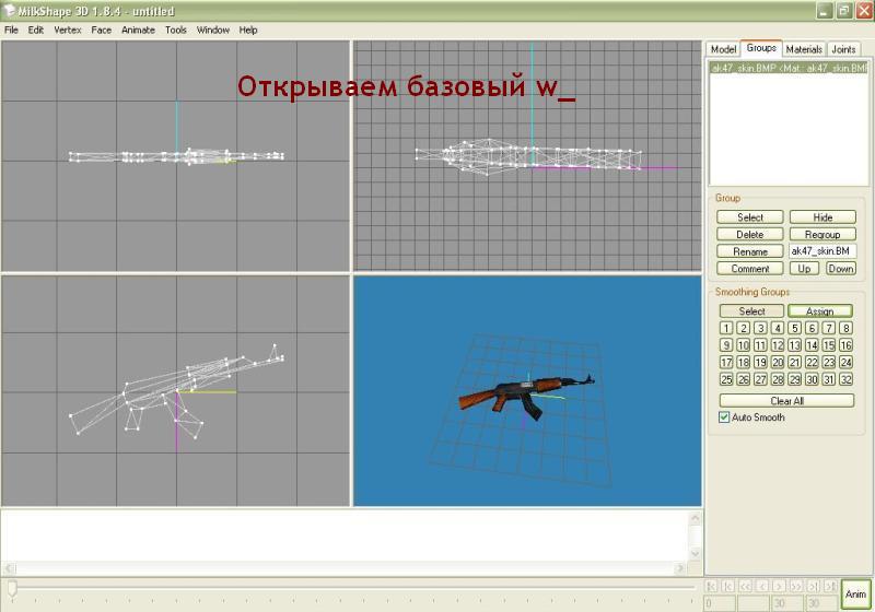 | Довольно часто встречаются модели оружия, имеющие только v_ файл, то есть тот, который виден в своих руках, и отсутствует w_ файл, то есть тот, который мы видим на земле. Так вот сейчас расскажу как можно быстро сделать из v_ модели еще и w_ модель. Для этого нам понадобятся: 1) Программа MilkShape 3d - редактор 3d моделей например (http://csexe.com.ua/load/71-1-0-5131); 2) Исходная v_ модель, w_ файл которой хотим сделать (возьмем к примеру АК-47 с ГП); 3) Базовый w_ файл, по которому и будем делать w_ файл исходной модели (возьмем к примеру w_ от стандартного АК-47) Пункт 1. Запускаем MilkShape, декомпилируем исходный v_ файл, вверху вкладка Tools/Half-Life/Decompile CS Left MDL File. Процесс декомпиляции закончен, импортируем корневой .smd файл с нашим автоматом, вкладка File/Import/Half-Life SMD и выбираем .smd с нашим автоматом (в данном случает test.smd). В разных моделях он называется по-разному, но думаю найти его будет легко (можно прочитать в скрипте .qc, различные .smd с названиями shoot, draw, reload, idle - это файлы анимации, их не будем трогать). После импорта в MilkShape появится наш автомат - в трех измерениях и вид в 3d. На меню слева в графе Select Options выбираем Vertex и начинаем редактировать наш автомат - выделяем лишние точки и удаляем их кнопкой Del на клавиатуре. Если присутствуют руки или прочие громоздкие объекты - можно щелкнуть по вкладке Groups на меню слева, выбрать этот объект (например руки - это часто hands и thumbs) и удаляем их целиком. После редактирования экспортируем заготовку обратно в .smd - вкладка File/Export/Half-Life SMD/test.smd. Пункт 2. Перезапускам MilkShape или просто делаем File/New, декомпилируем наш базовый w_ файл - Tools/Half-Life/Normal HL Left MDL File, затем импортируем .smd с автоматом (в большинстве случаев называется w_ak47.smd), главное - на появившемся окошке выбрать галочками Triangles, Skeleton и Rename Bones, и у нас в MilkShpae появится модель стандартного автомата (та, что на земле). Пункт 3. Импортируем сюда же тот наш сохраненный test.smd с отредактированной v_ моделькой, но импортируем только Triangles, а Skeleton и Rename Bones - убираем галочки. Таким образом у нас в программе сразу 2 автомата - стандартный w_ и наш v_. Как видим наш v_ находится в другом месте и развернут в другую сторону, да и размеры не совпадают. Подгоняем его под w_ файл.Выделяем мышкой, либо во вкладке в меню Groups наш автомат и начинаем его вертеть и перемещать - кнопка Rotate - позволяет поворачивать модель во всех измерениях (жмем ее и мышкой поворачиваем модель в нужном направлении), кнопка Scale - позволяет уменьшать или увеличивать (удобнее после ее нажатия пользоваться цифрами внизу - стандарт 1.0, чуть увеличить 1.1, чуть уменьшить 0,9 и так далее). С помощью кнопки Move перемещаем модель во всех трех направлениях. В конечном итоге наш автомат должен совпадать по размера и положению с базовым w_ автоматом, они должны практически совпадать. Как только добиваемся этого - заходим на вкладку Groups, выбираем в списке части базового автомата w_ модели и удаляем ее теперь на том месте где он был находится наш v_ автомат. Дальше привяжем кости - снова в Groups выделяем все части нашего автомата, когда это сделано - переходим на вкладку Joins, там будет только одна кость, зачастую с названием Line02, выбираем ее и жмем кнопочку Assign, привязали. Пункт 4. Экспортируем все это из MilkShape, но не в test.smd, а уже в w_ak47.smd, затем произведем компиляцию w_ модели - вкладка Tools/Half-Life/Compile QC File и в качестве этого самого .qc скрипта указываем тот, который появился после декомпиляции w_ модели